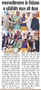 आज दिनांक 27 दिसंबर को FMCSL OF INDIA के निदेशक मंडल एवं डेलीगेट की एक महत्वपूर्ण बैठक कंपनी के अध्यक्ष श्री राम कुमार वालिया जी के अध्यक्षता में आर्य समाज मंदिर बी2 सफदरजंग एनक्लेव नई दिल्ली में संपन्न हुई सभा में सर्वसम्मति से कई प्रस्ताव पारित किए गए तथा सभी सदस्यों/डेलीगेटो एवं निर्देशको ने कंपनी के अध्यक्ष श्री राम कुमार वालिया में पूर्ण आस्था एवं विश्वास व्यक्त करते हुए उनको अपना अध्यक्ष स्वीकार किया तथा उनके नेतृत्व में उनके साथ चलने का एक स्वर में शपथ ली तथा कई प्रस्ताव पारित किये तथा कंपनी के आगामी कार्यक्रमों के बारे में विस्तार से चर्चा की तथा कार्यक्रम तय किये जिसके अंतर्गत दिनांक 10 जनवरी से कंपनी के डेलीगेट निदेशक मंडल और अध्यक्ष सभी विभिन्न क्षेत्रों में जाएंगे तथा लोगों को जागरुक करते हुए अपनी कंपनी का प्रचार करने के साथ-साथ किसान जन जागरूकता सभा आयोजित करने के साथ किसानों को जागरूक करने का काम करेंगे।